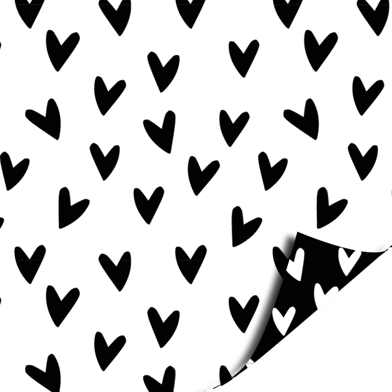 Dit dubbelzijdige cadeaupapier heeft een moderne, speelse en toch stijlvolle uitstraling. De voorzijde toont een zwarte achtergrond met witte hartjes in een handgetekende look, terwijl de achterzijde precies het omgekeerde laat zien: zwarte hartjes op een frisse witte basis. Dankzij deze omkeerbare stijl kun je creatief variëren met accenten, omslagen en combinaties. Het stevige papier vouwt mooi en blijft strak zitten, ideaal voor cadeaus, decoraties en creatieve projecten.