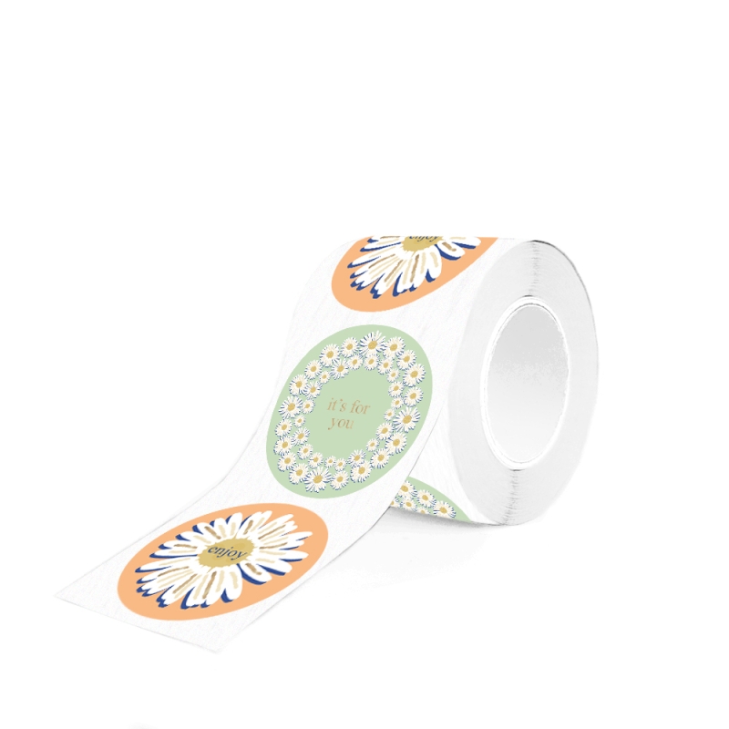 Prachtige stickers met madeliefjes op een zalm kleurige en licht groene ondergrond om je cadeau, envelop, verpakking of snailmail mee af te werken.