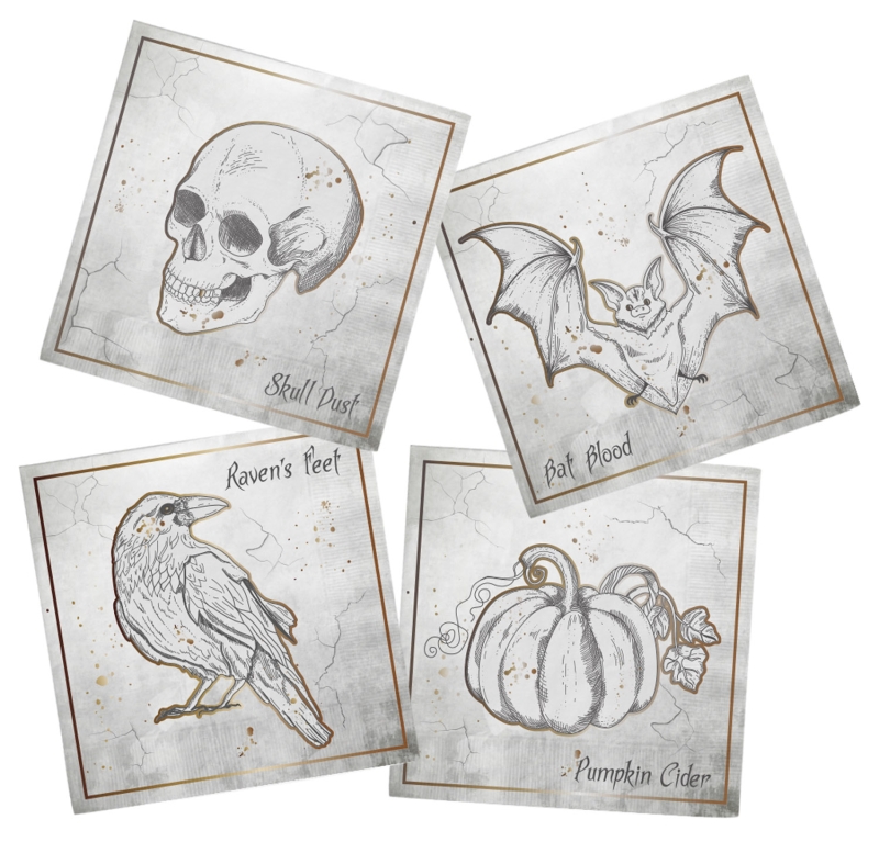 Breng je Halloweenfeest tot leven met een complete decoratieset die sfeer en mysterie ademt. De papieren servetten vormen de basis van de tafel en zijn bedrukt met vier unieke illustraties: een schedel, vleermuis, raaf en pompoen, elk voorzien van een bijpassende naam zoals “Skull Dust” en “Pumpkin Cider”. De verweerde achtergrond en vintage tekenstijl zorgen voor een griezelige uitstraling die perfect past bij een spannend feest of creatieve hobbyprojecten zoals decoupage.